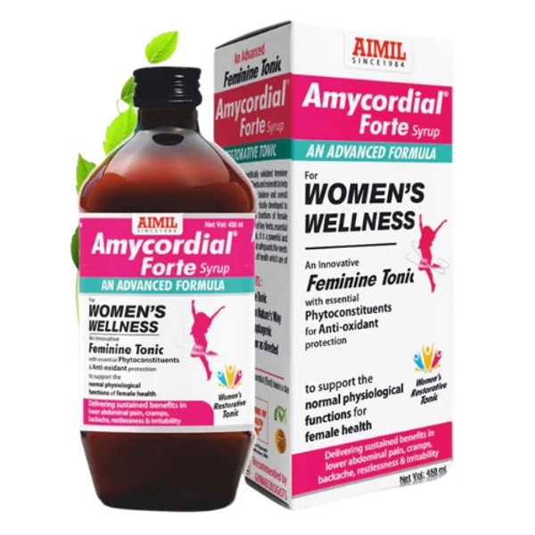Amycordial forte syrup is an advanced formulation for women's health. This innovative feminine restorative tonic with essential phyto constituents and antioxidant protection promotes normal physiological functions in female health, providing long-term relief from lower abdominal pain, cramps, backache, restlessness, and irritability.