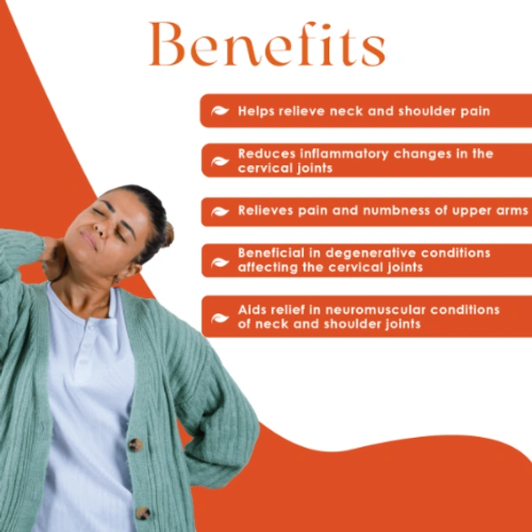 Arya Vaidya Pharmacy (AVP) Cervijith Capsule (100Caps) is an Ayurvedic formulation designed to relieve symptoms associated with cervical spondylosis and cervical spondylitis. It contains a potent blend of 25 herbs such as Prasarini, Guggulu, Nirgundi, Rasna, and Devadaru, processed in traditional mediums like sesame oil (Tila Thaila), curd (Dadhi), cow's milk (Goksheera), and fermented rice gruel (Dhanyamla). This capsule helps reduce neck and shoulder pain, inflammation, numbness, and swelling while supporting the health and function of cervical joints. It also aids in easing stiffness and improving mobility, promoting overall neuromuscular wellness of the neck and shoulder region.
