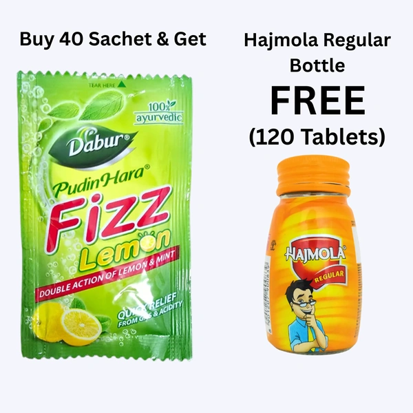 Dabur Pudin Hara Fizz (Lemon) 40 Sachet + Hajmola Regular Bottle (120tab) Free