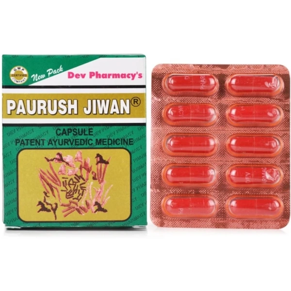 Paurush Jiwan Capsule by Dev Pharmacy acts as an immune system booster and helps in maintaining your vitality and health in a natural manner. It is specifically formulated to assist the healthy functioning of the liver and detoxification, promoting a healthy and more active lifestyle. It has akruti in smoothing digestion that assists in alleviation of gastrointestinal discomfort + this Ayurvedic supplement is helpful in relieving constipation and checking smooth bowel movement. Paurush Jiwani Capsule, with its distinctive combination of ingredients, has been known to help relieve mental fatigue and digestive complaints/Women. It helps to boost energy and metabolism which in return results in better health,good sleep and a properly functioning digestive system. Both men and women can improve their health and vitality with the help of this supplement.