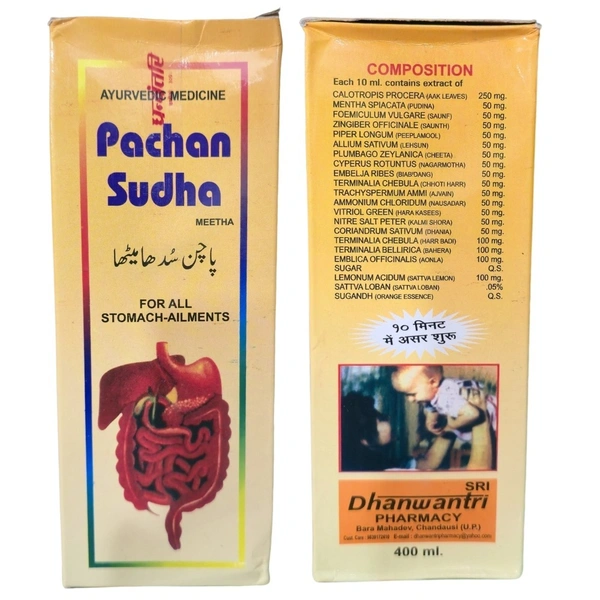 Dhanwantri Pachan Sudha Meetha 400 ml is a credible Ayurvedic syrup to compliment the digestive process and alleviate stomach related ailments. It contains a combination of strong herbal extracts that helps to control indigestion, gas, bloating and overall digestive distress. It's tasty, so everybody wants to enjoy it and feels comfortable with consumption of it.