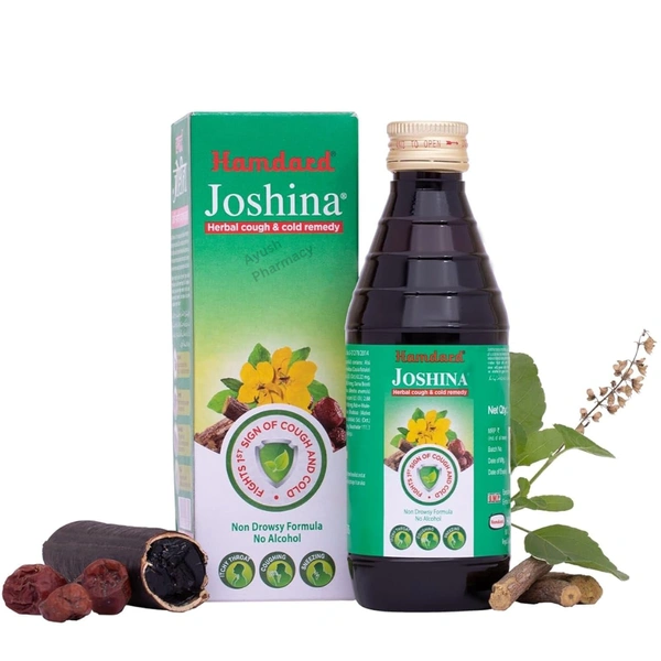 Grab 100% genuine, sealed Hamdard Joshina Syrup from reliable stocks. Benefit from fast pan-India delivery, Cash on Delivery options, and free shipping on orders above ₹1000. Trust Ayush Pharmacy for your family's cough relief needs.