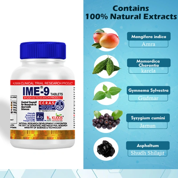 Regulation of Blood Sugar: IME-9 Tablets are a combination of herbs and natural ingredients that have been proven effective in their blood sugar regulating ability. This promotes glycemic control which is a core principle of diabetes management.
