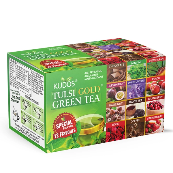 Kudos Tulsi Gold Green Tea With 12 Flavours (24 Tea Bags) 100% genuine product.