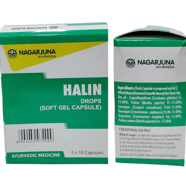 Nagarjuna Halin Drops (Soft Gel Capsule) (50 capsules) is an Ayurvedic proprietary medicine primarily used to relieve nasal congestion, common cold, and sinusitis.
