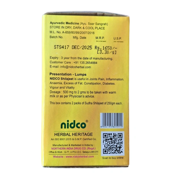 Add Nidco Shilajeet Purified with Trifla (Lump) 500gm to your routine from AyushPharmacy.com and support your daily strength, stamina and inner vitality the traditional Ayurvedic way.