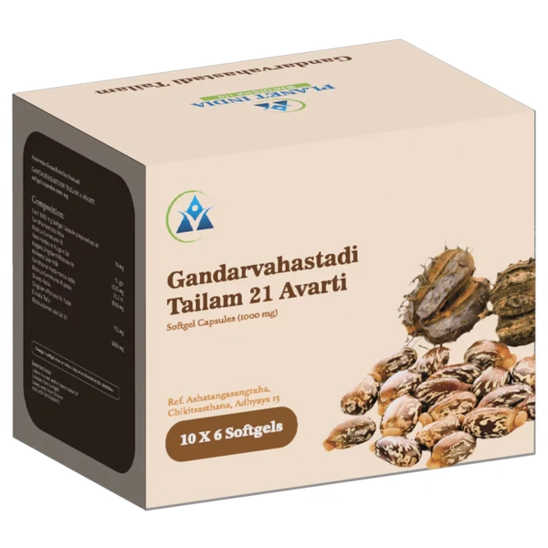 Planet India Gandhwarshasthadi Tailam 21 Avarti Softgel Capsules – 1000mg (60 Caps)