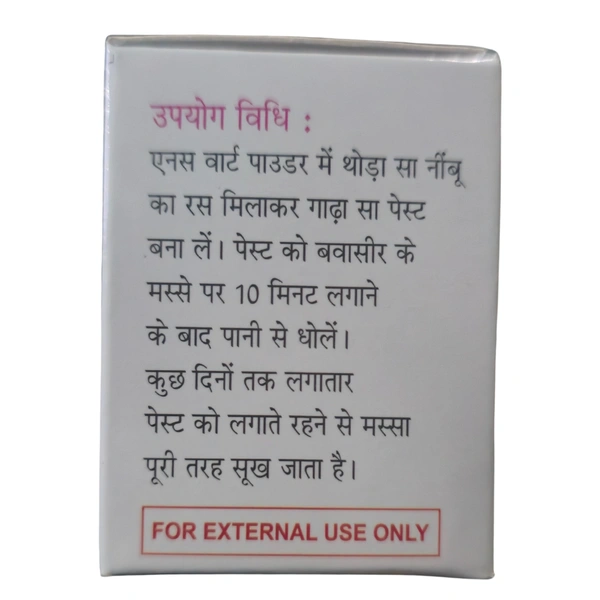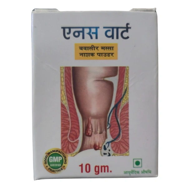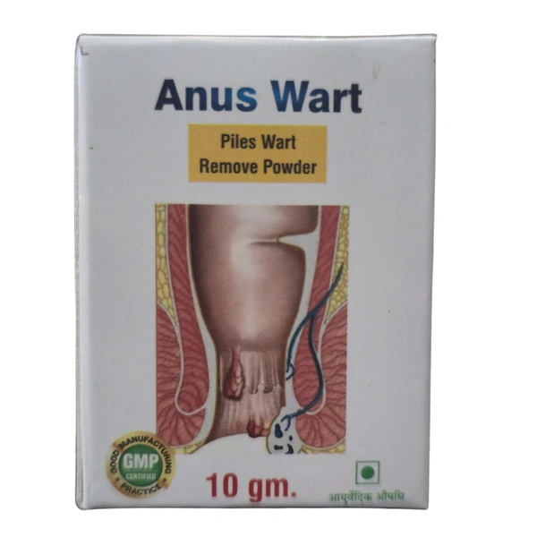 Anus Wart is an Ayurvedic powder specially formulated for the effective removal of piles warts (masses) and rectal outgrowths. The product helps in drying and reducing warts associated with piles and offers relief from discomfort. Regular application as per the instructions safely shrinks the wart, supporting the healing process. GMP certified and safe for external use, this powder is a reliable addition to your piles management regimen.