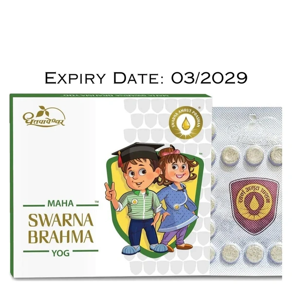 A dispersible tablet made for Swarna Prashan is called Maha Swarna Brahma Yog. It includes Medhya Dravya, such as Brahmi Ghana and Shankhapushpi Ghana, in addition to Suvarna Bhasma. Children in the age range of two to sixteen years old are advised to use this product. With every administration of Swarna Prashan, it delivers an exact dosage of 2.35 mg of standardized Swarna Bhasma. It strengthens immunity and aids in improving children's memory and focus.
