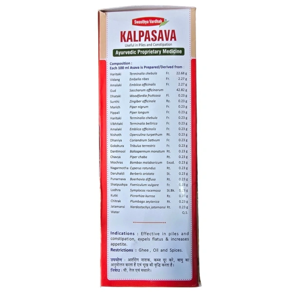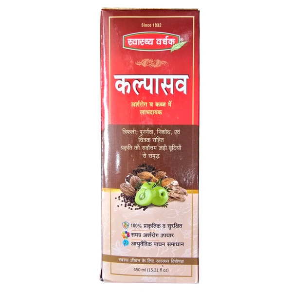 Enriched with researched ingredients like Triphala (useful in boils, carbuncles, and abscesses), Kalpasava helps reduce burning sensations, relieves painful and inflamed itching, reduces anal discomfort, and boosts the body's innate healing processes to better stomach health and eradicate piles.
