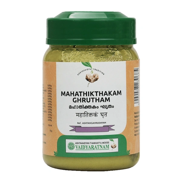 Vaidyaratnam Mahathikthakam Ghrutham is a signature Ayurvedic herbal ghee crafted by Vaidyaratnam Oushadhasala. Copyrighted by tradition, the name “Mahathikthakam” means “Great Bitter,” because the recipe combines six carefully selected bitter plants. These herbs are cooked in pure cow's ghee, making their goodness easier for the body to absorb.