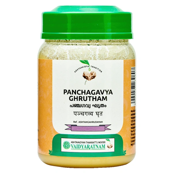 Vaidyaratnam Panchagavyam Ghrutham (150gm) is a traditional Ayurvedic formulation used primarily for neurological and psychological conditions like epilepsy, insanity, and jaundice. It is also beneficial for improving memory, controlling fever and inflammation, and treating various skin disorders.