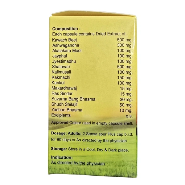 Sensa Spur Plus is an Advanced Herbal-Mineral Blend for Moderate to Severe Oligospermia. with Kavach Beej, Ashwagandha & Makardhwaj, It Supports Sperm Health & Fertility.
